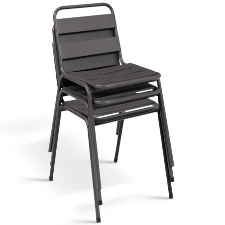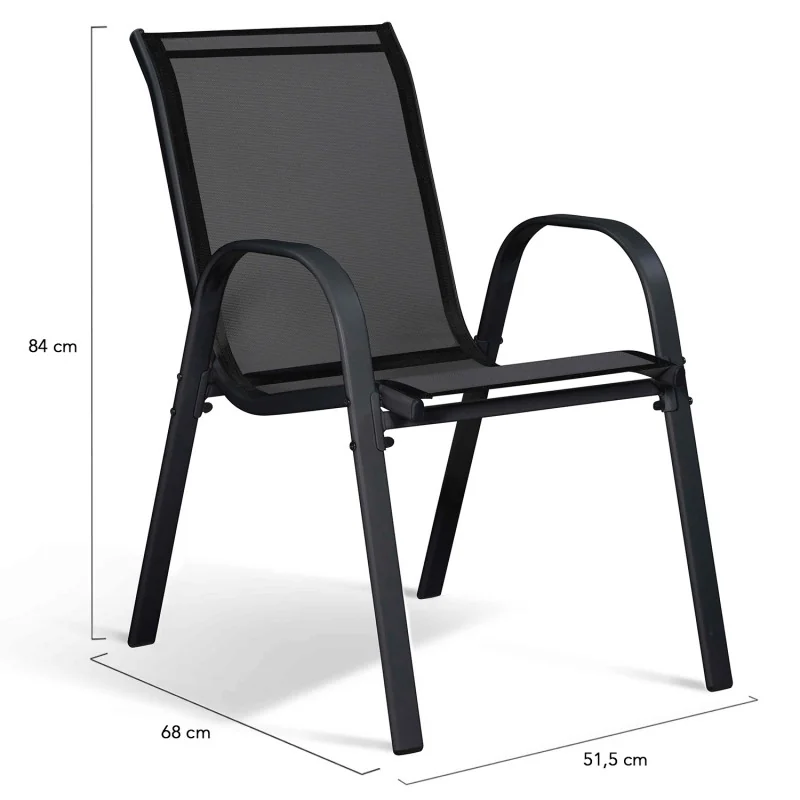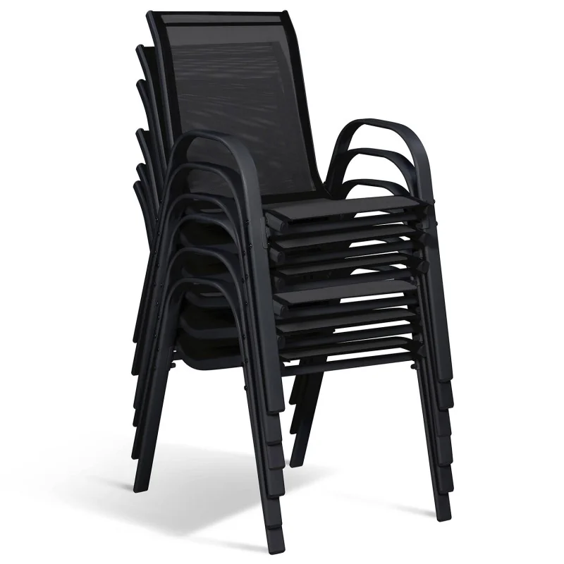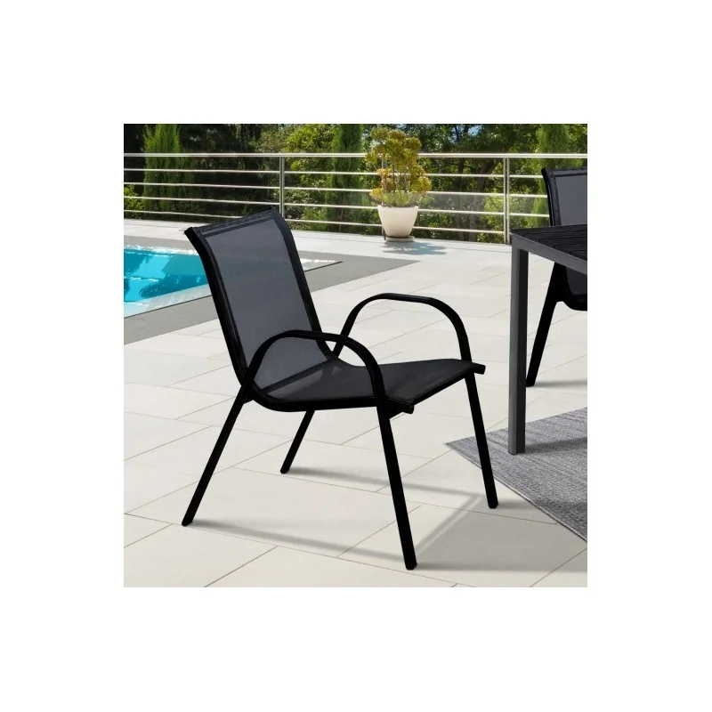 Peu d'entretien. Structure métal et toile textilène. Empilables