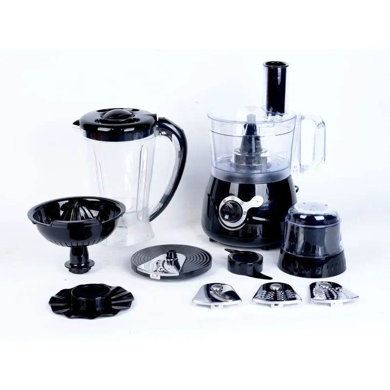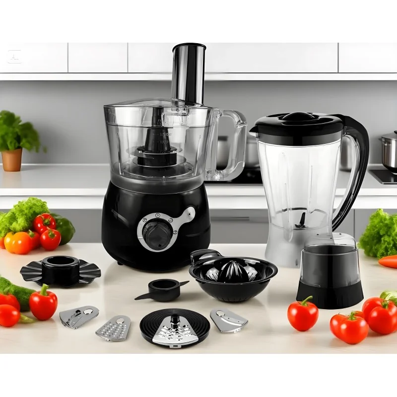 avec 4 disques de lames interchangeables, 1 presse agrume, 1 bol à viande 1,2L , 1 blender de 1,75L et 1 mini bol pour vos assaisonnements.