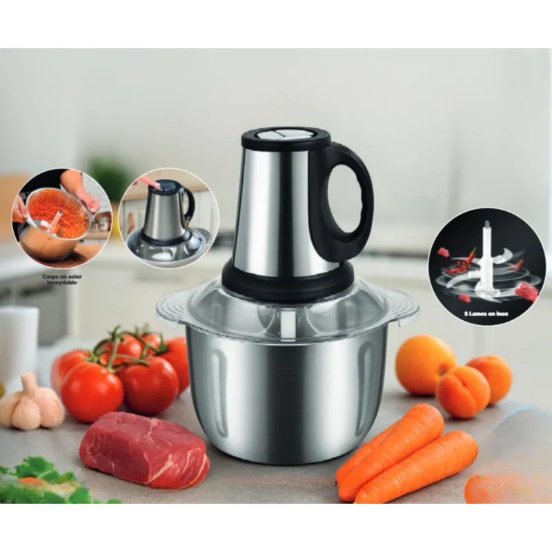 Corps compact en acier inoxydable: Un design élégant et moderne, facile à nettoyer et à utiliser. Parfait pour une intégration discrète dans votre cuisine. Système d'embrayage métal contre métal ultra-résistant: Une technologie robuste garantissant une durabilité exceptionnelle et des performances optimales même sous une utilisation intensive. 5 lames en acier inoxydable et base antidérapante en caoutchouc: Coupe précise et rapide grâce aux lames tranchantes, avec une stabilité maximale assurée par la semelle antidérapante. 3 vitesses réglables pour polyvalence: Adapté à une grande variété d’aliments : choisissez la vitesse basse pour les ingrédients délicats et la vitesse haute pour les tâches plus exigeantes. Multifonctionnel pour tous vos besoins: Idéal pour hacher, mixer ou concasser : viandes, fruits, cacahuètes, noix, légumineuses, et bien plus encore. Une solution tout-en-un pour vos préparations culinaires. Puissance: 300W - Capacité: 3L
